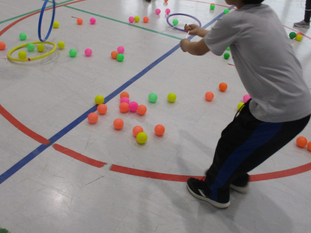 今月のおもいっきり😊ASOBIはカラーボールをフラフープを使って集める「カウボーイボール集め」を行いました!真ん中の円に集まったカラーボールをひものついたフラフープを投げてキャッチ!自分のチームの陣地まで運びます♪チームで作戦を考えておもいっきり遊ぶことができましたね☆