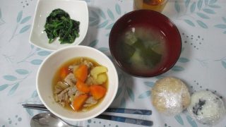 今月のはらぺこクラブでは、わかめとおかかのおにぎり、肉じゃが、ほうれん草の胡麻和え、わかめの味噌汁の4品を作りました!具材を切ったり、炒めたりと作業がたくさんあったけど、分担しながら作りました◎美味しい料理が完成しました☆